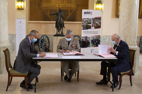 De gauche à droite : Sylvio Quincey, secrétaire général du Foyer des Invalides, le général Christophe de Saint Chamas, gouverneur des Invalides, et Dominique Burlett, président de La France Mutualiste.