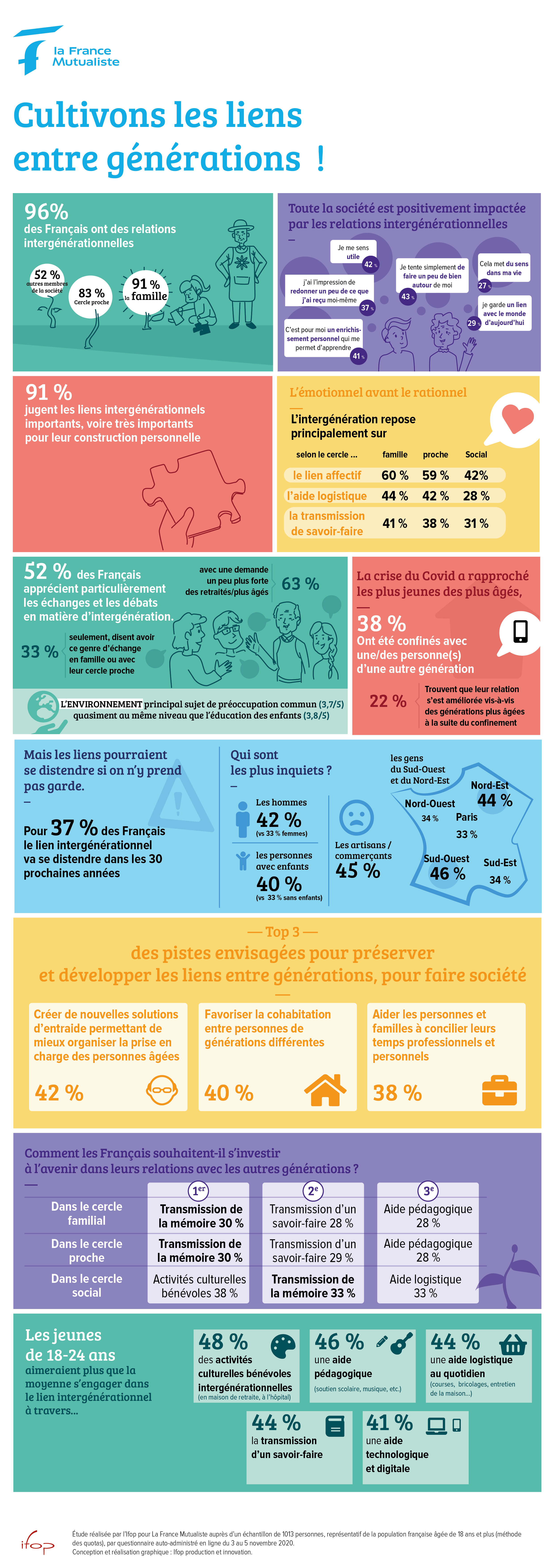 L'étude menée par l’IFOP dresse un état des lieux du lien intergénérationnel et de son évolution avec la crise de la Covid-19 : de quelle nature sont nos relations aux autres ? La crise sanitaire a-t-elle rapproché les générations ? Quelles sont les perceptions pour les 30 années à venir ? et les pistes pour cultiver les liens ?